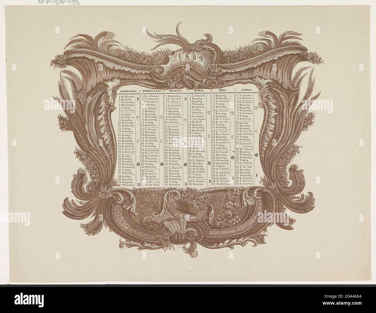 Calendar For 1849 The First Six Months Of The Year With The Days Of The Week And The Positions Of The Moon Completely In An Ornamented Picture Frame With Flowers And Plants